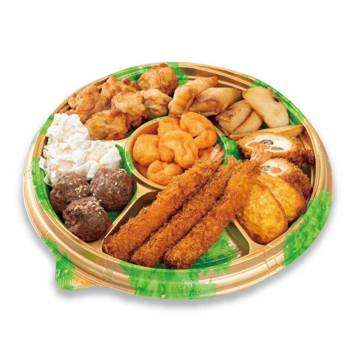 海老フライ、海老チリ、肉団子、シューマイ、春巻き、鶏唐揚げ、ポテト、ささみカツ、オムレツ