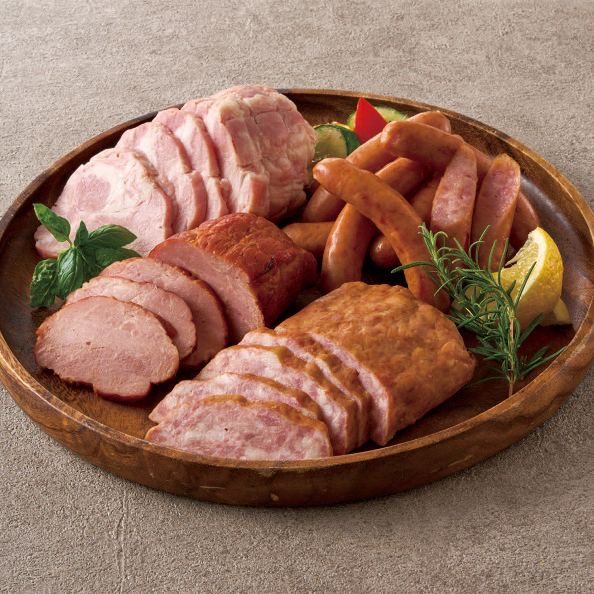 ホワイトロースハム270g、焼豚170g、ポークローフ190g、あらびきウインナー90g×2 サイズ縦216×横273×高さ74