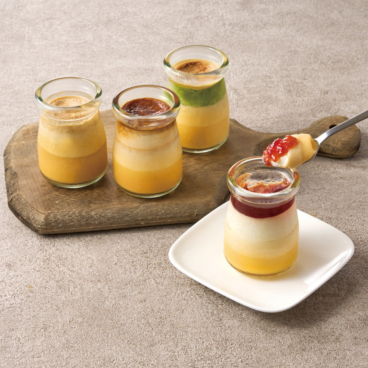 あまおう苺とゆめのか苺を使用したストロベリーチーズプリンと、4層仕立てのキャラメルブリュレを詰合せました。