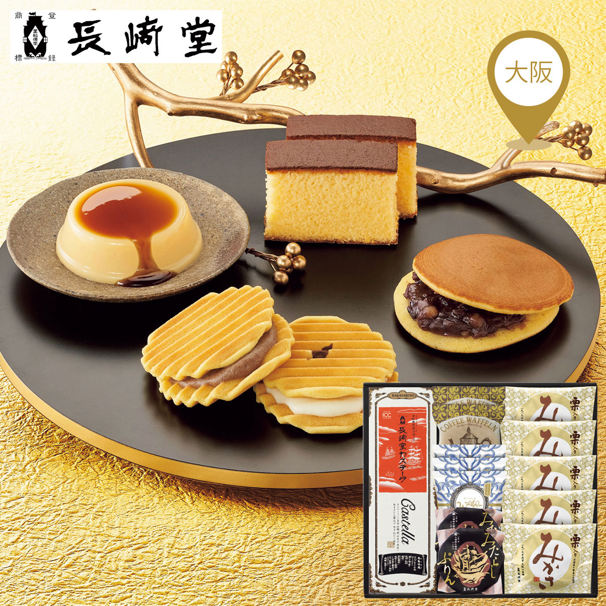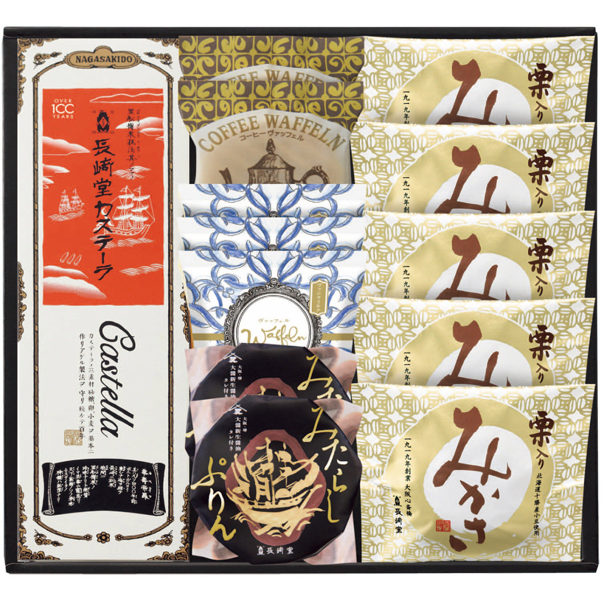 カステーラ(5切入)×2、みたらしぷりん・珈琲ヴァッフェル×各2、ヴァッフェル×3、栗みかさ×5 サイズ縦333×横300×高さ69