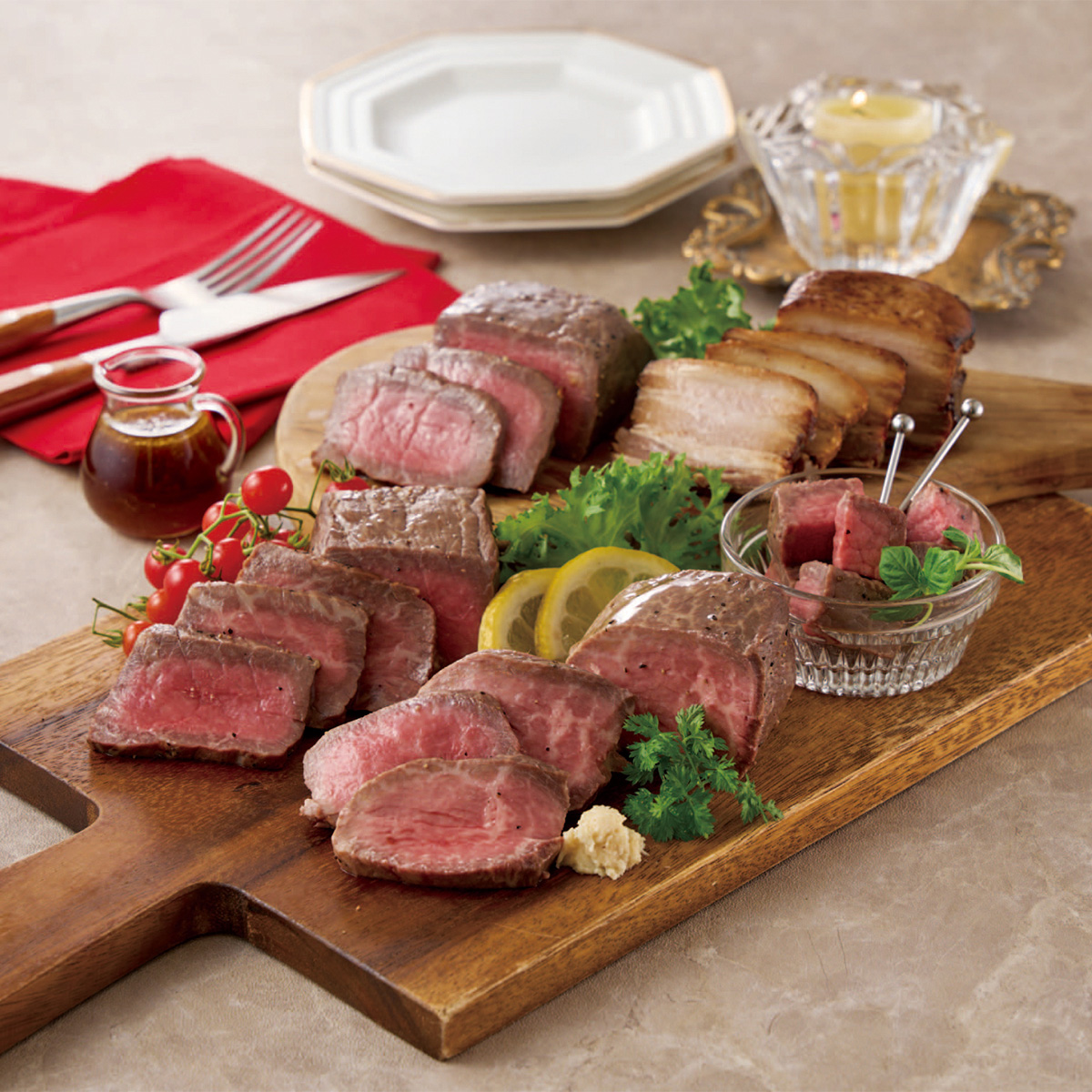 黒毛和牛のうちもも肉、マル肉、そともも肉の3部位を使用したローストビーフと、黒豚を使用した焼豚のセット。それぞれの部位の味や食感をお楽しみいただける、食べきりサイズのセットです。