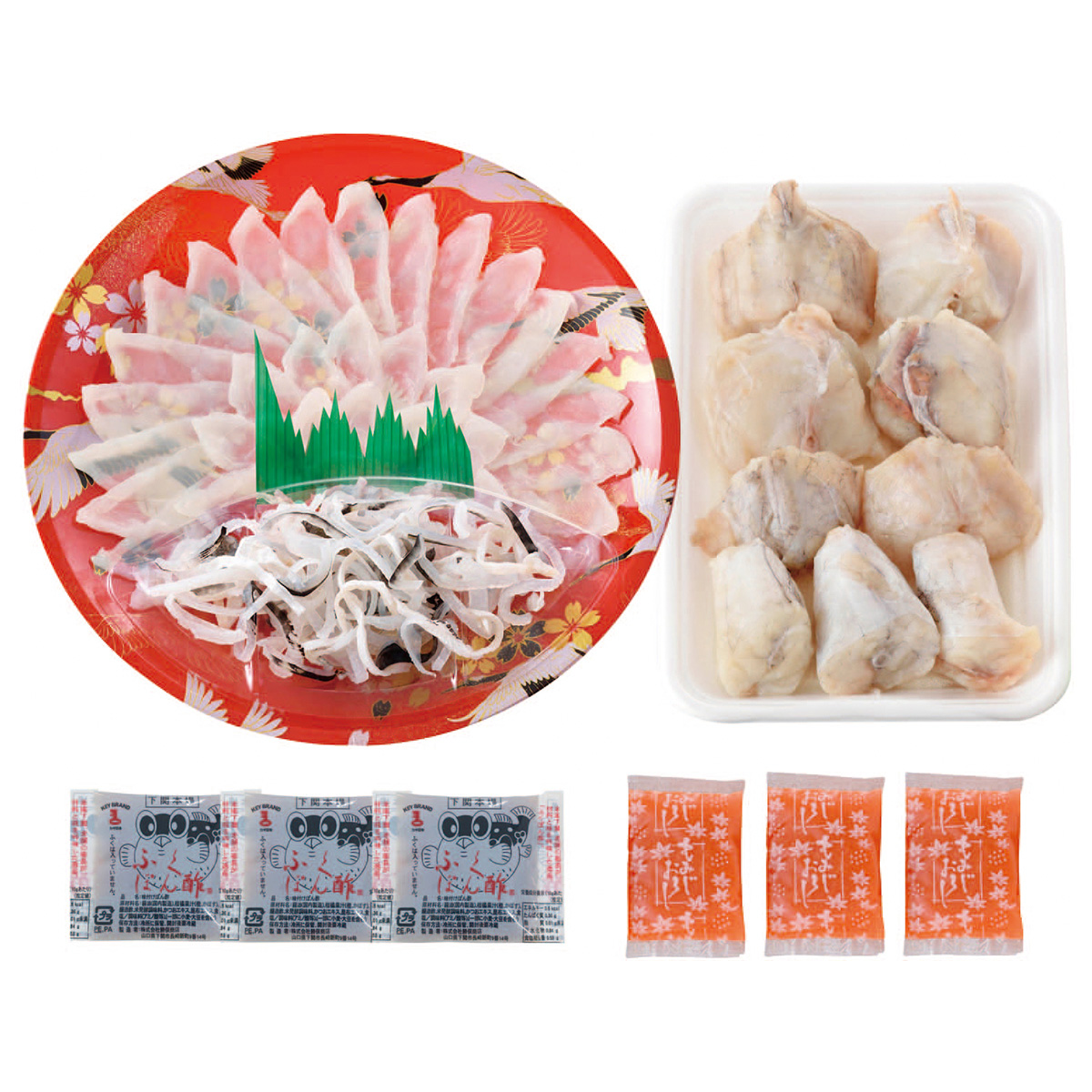 真ふぐ霜降り刺身45g、とらふぐ皮20g、真ふぐちり(切身)200g、ふくポン酢・もみじおろし各10g×各3(国産原料を使用、山口県にて加工) サイズ縦284×横284×高さ92