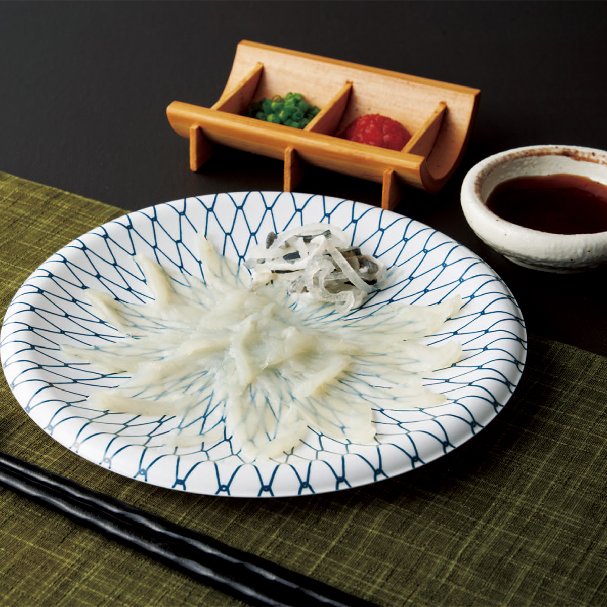 トラフグ刺身20g・トラフグ皮刺し10g・ポン酢14g・もみじおろし2.5g×各3(国産原料を使用、山口県にて加工) サイズ縦230×横310×高さ100