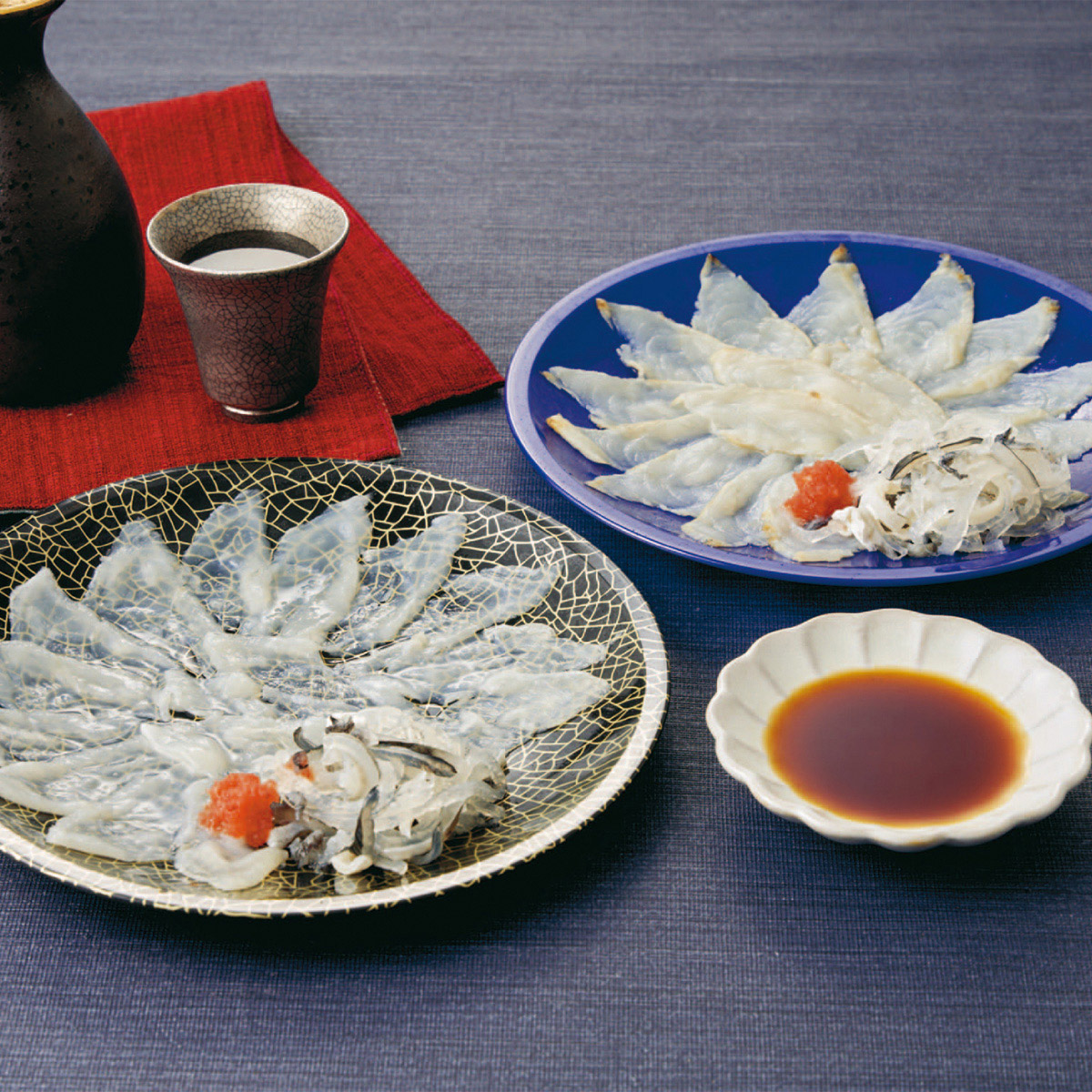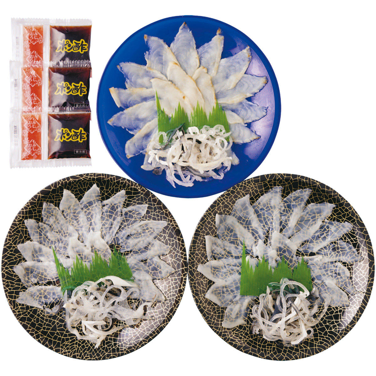 とらふぐ(刺身20g・皮15g)×各2、(真ふぐたたき刺身40g・とらふぐ皮15g)、ポン酢12g・もみじおろし3g×各3(国産原料を使用、山口県にて加工) サイズ縦345×横240×高さ90