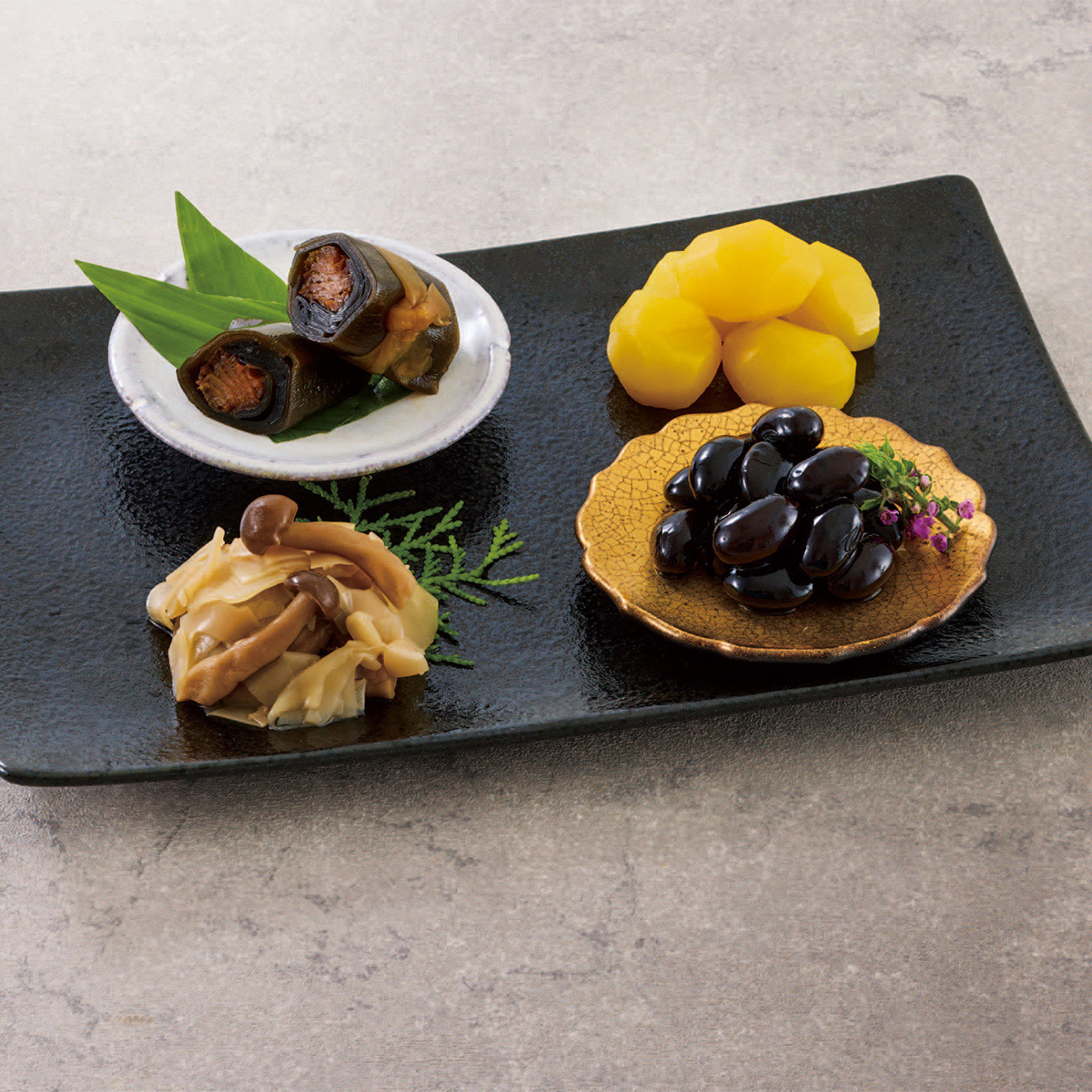 にしん昆布巻(2本)、栗甘露煮55g、黒豆45g、しめじ炊合せ50g サイズ縦177×横308×高さ66