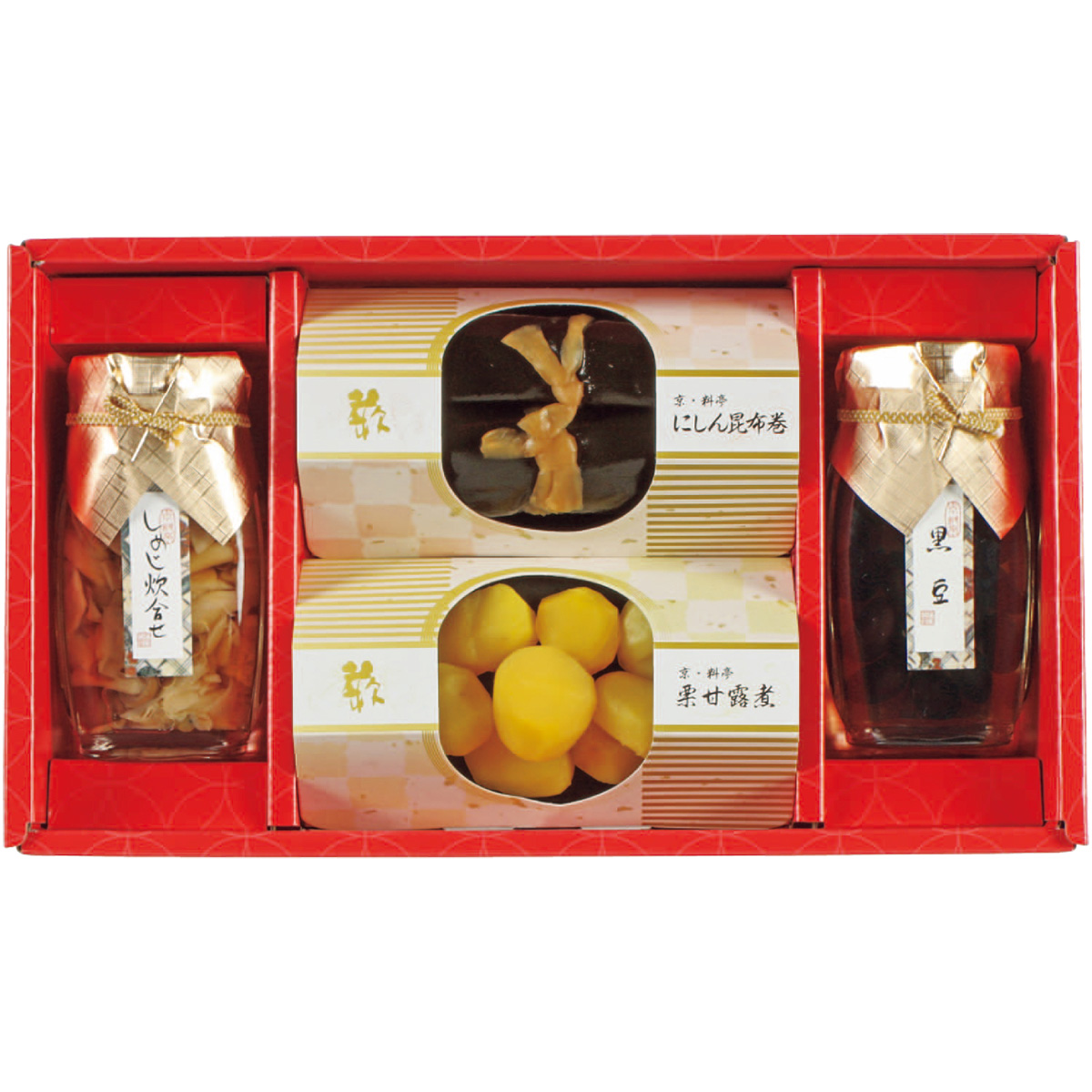 京都の料亭が作るおせち料理の贈り物です。丹波黒大豆を使用した黒豆、しめじを使用した炊合せなどを華やかに詰合せております。