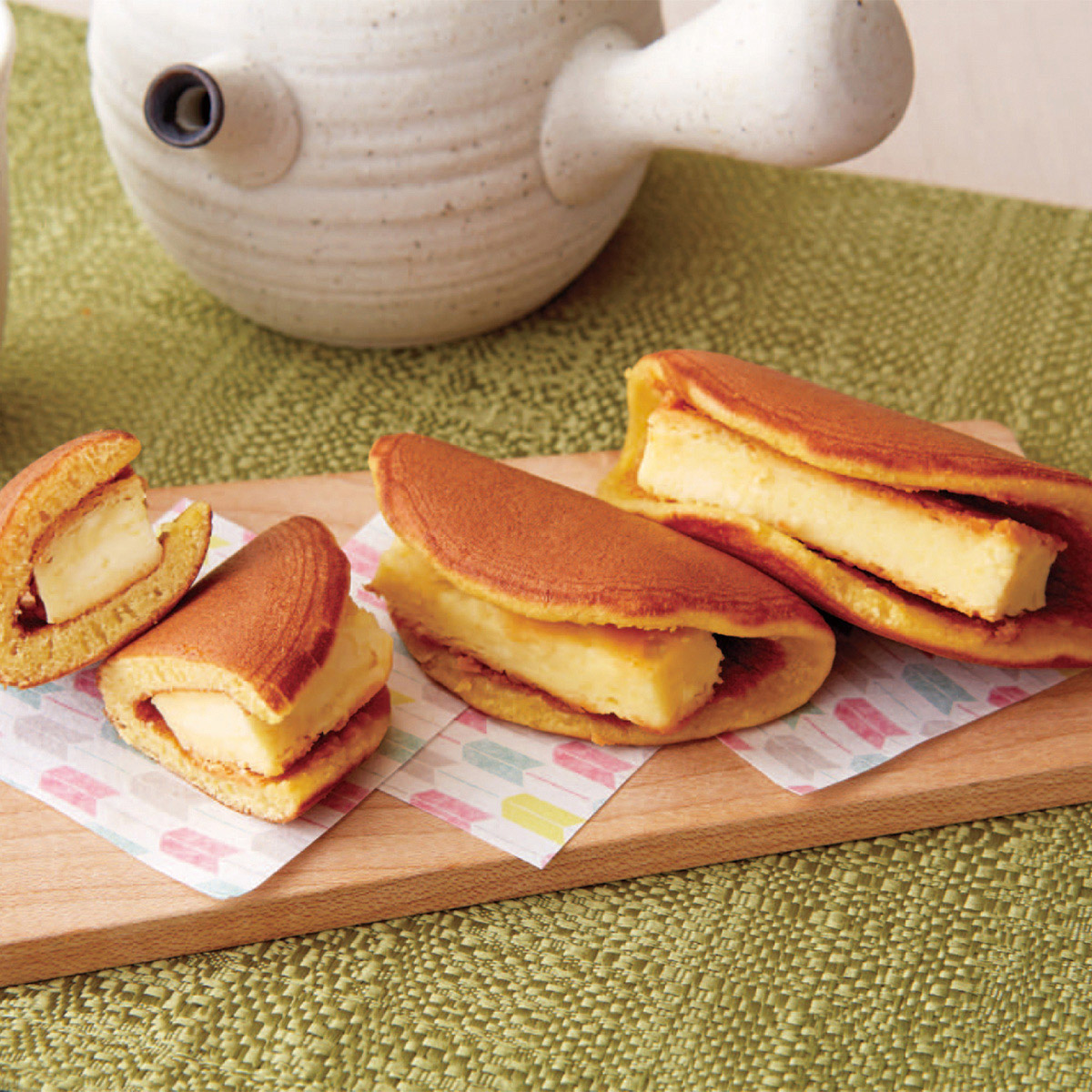 自家製のベイクドチーズケーキをアーモンド生地のどら焼きで包みました。