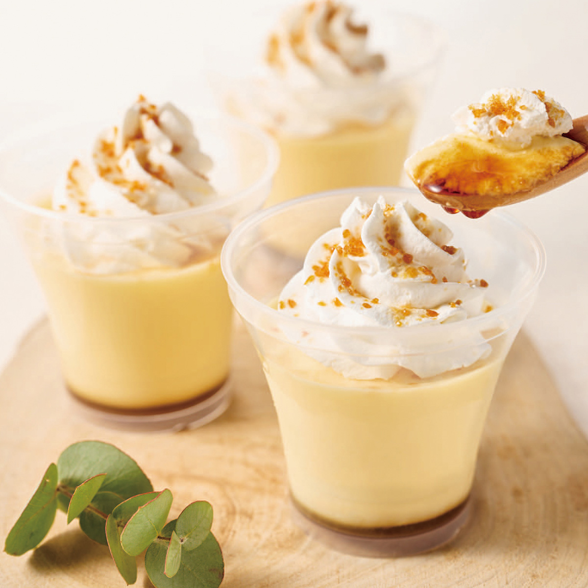 ふわトロの食感がやみつきに。カラメルソースが入った富良野産の生乳を使用したぷりんの上にクリームをかけました。カラメルクラッシュをかけてお召し上がりください。