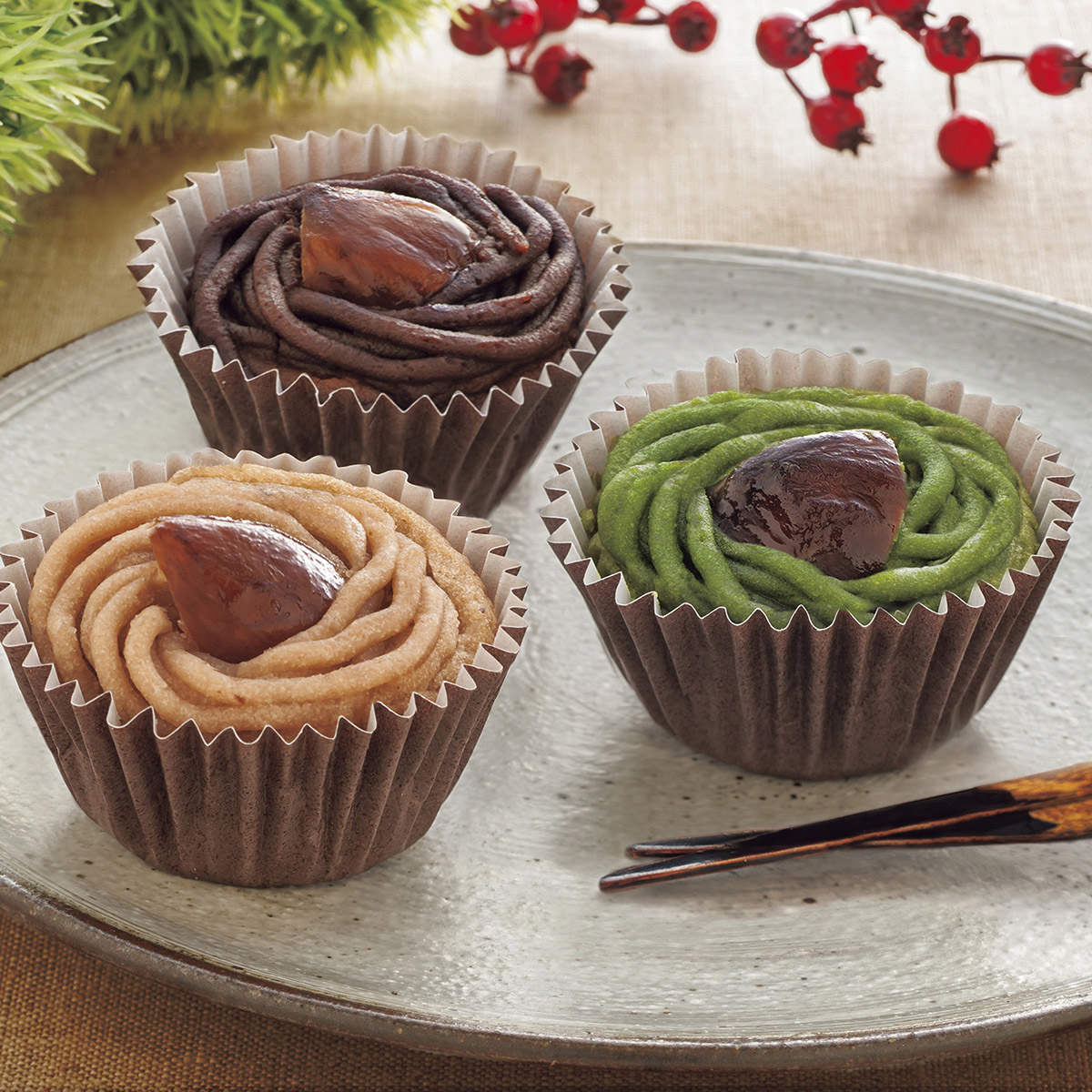 栗、抹茶、チョコの3種の焼きモンブラン。3種類の味が楽しめる詰合せです。