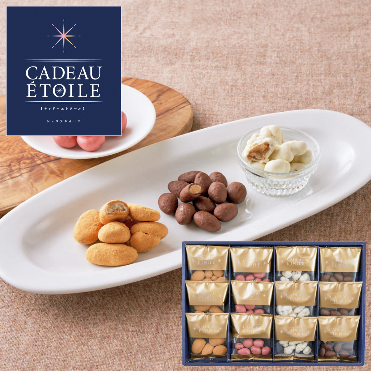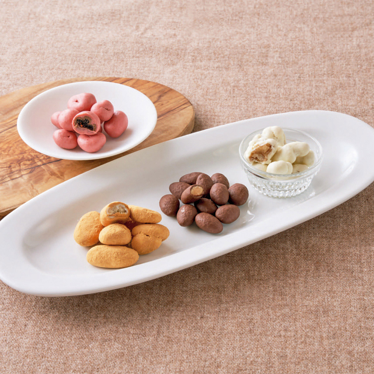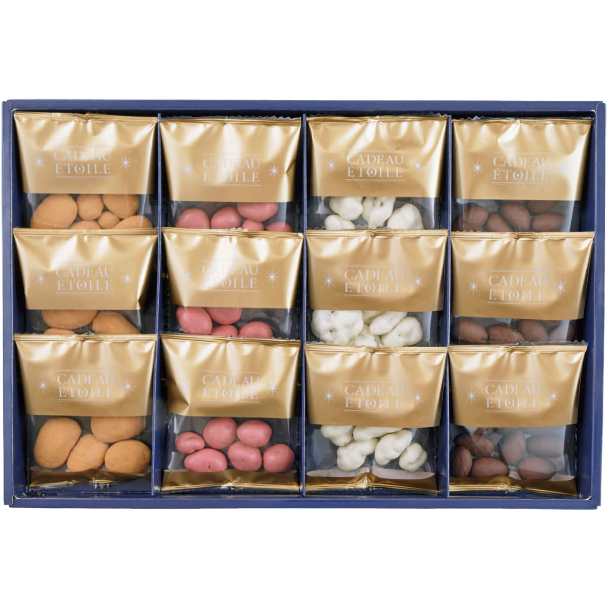 クルミ(ホワイトチョコレート)・アーモンド(ミルクチョコココア)・クランベリー(いちごチョコレート)・ピーカンナッツ(キャラメルチョコレート)×各3 サイズ縦235×横345×高さ35