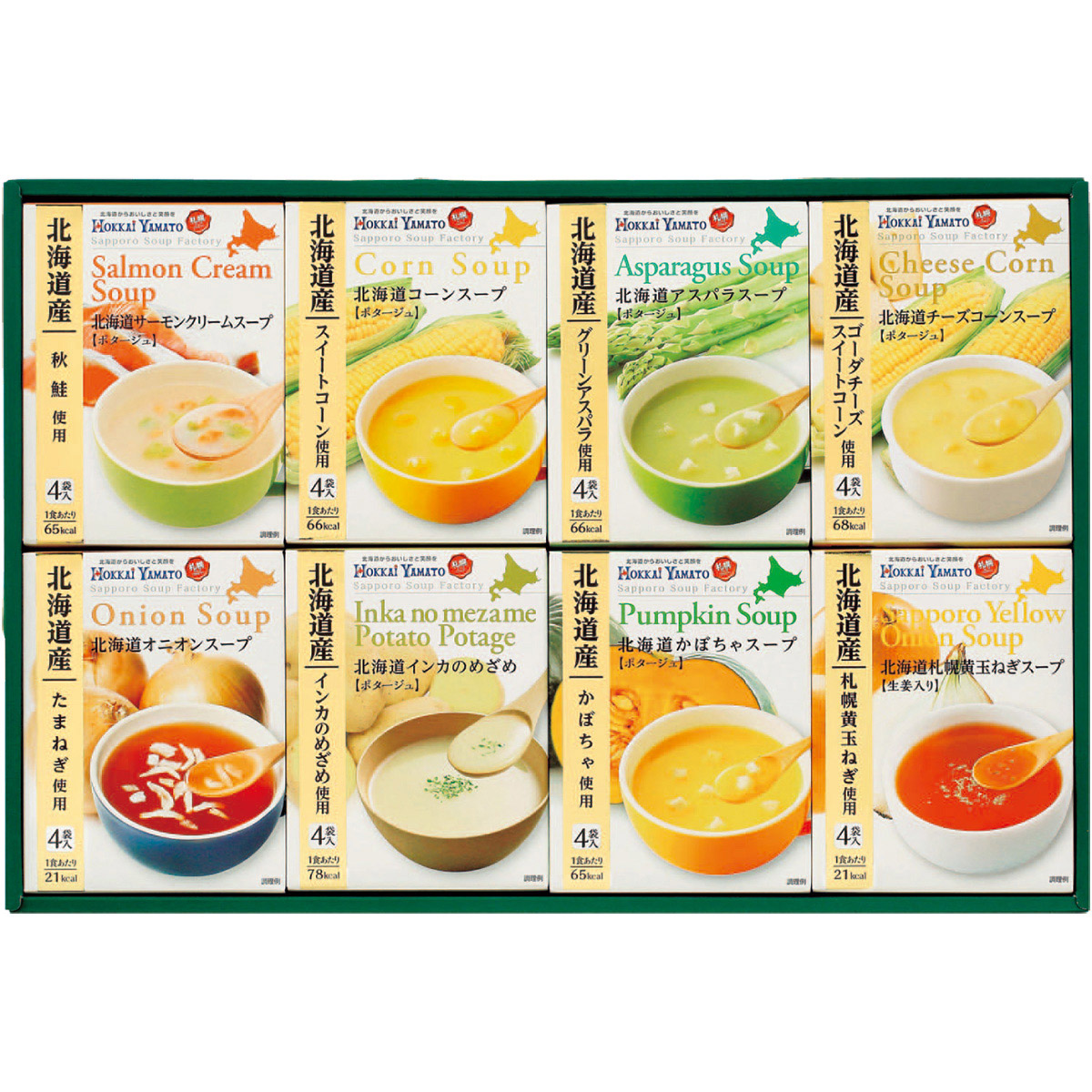 インカのめざめポタージュ20g・サーモンクリームスープ17.2g・コーンスープ16.5g・アスパラスープ16.5g・札幌黄玉ねぎスープ7g・かぼちゃスープ16.5g・オニオンスープ7g・チーズコーンスープ16.5g×各4P サイズ縦287×横426×高さ57