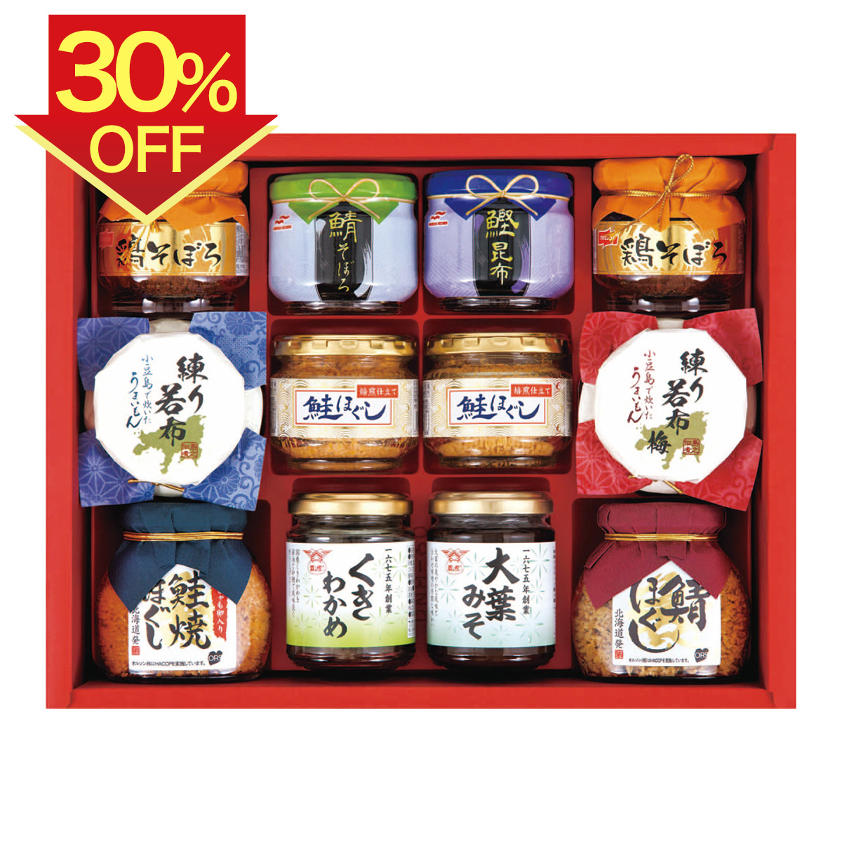 マルハニチロ(鰹昆布・鯖そぼろ)各45g、酒悦(大葉みそ115g・くきわかめ80g)、鯖ほぐし60g、鮭焼ほぐしししゃも卵入り50g、鮭ほぐし40g×2、練り若布80g、練り若布梅80g、ニッスイ鶏そぼろ50g×2 サイズ縦255×横336×高さ80