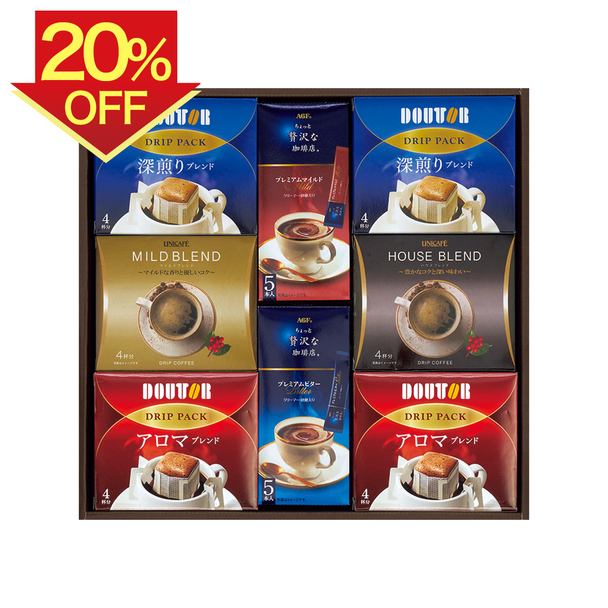 ドトールドリップパック(深煎りブレンド・アロマブレンド)各7g×各4P×各2、ちょっと贅沢な珈琲店スティックコーヒー(プレミアムマイルド・プレミアムビター)各7g×各5P、ユニカフェドリップコーヒー(ハウスブレンド・マイルドブレンド)各7g×各4P サイズ縦340×横354×高さ45