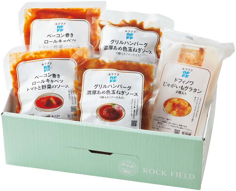 グリルハンバーグ(濃厚あめ色玉ねぎソース)160g・ベーコン巻きロールキャベツ(トマトと野菜のソース)210g×各2、ドフィノワじゃがいもグラタン200g(2個入)