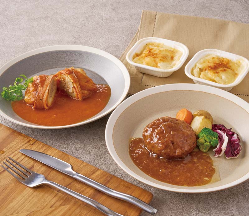 野菜の甘みが感じられるトマトソースの柔らかなロールキャベツや、じっくり炒めた玉ねぎソースと丁寧に焼き上げたジューシーなハンバーグ、チーズの香りとコクを閉じ込めた濃厚なプチグラタンの詰合せ。