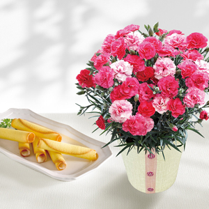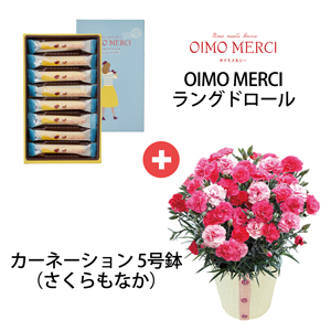 様々なピンク色が楽しめるカーネーションとオイモメルシーのラングドロールをセットでお届け。