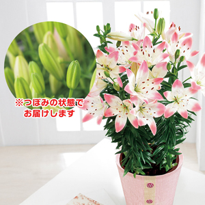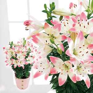 クリーム色とピンク色の2色咲きが魅力のスカシユリです。通常のユリと比べ背丈が低く、コンパクトにまとまります。切花としてもお楽しみいただけます。