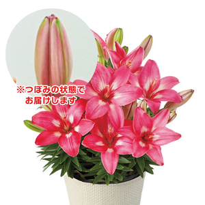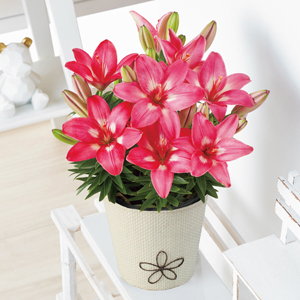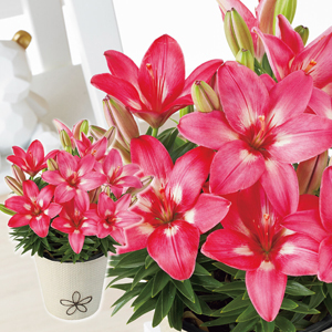 鮮やかな色合いが目を引くコンパクトタイプのユリ。鉢いっぱいに咲く姿は、まるでブーケのようです。