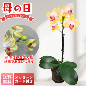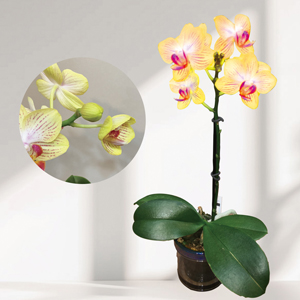ビタミンイエローの花色に赤いストライプが入る個性的な胡蝶蘭です。