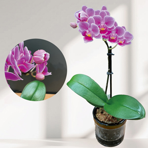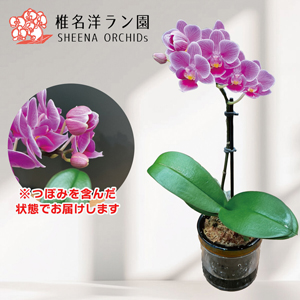 蛍光ピンクの花弁に濃い目のピンクの筋が入るかわいらしい花色が特長的な品種の胡蝶蘭です。
