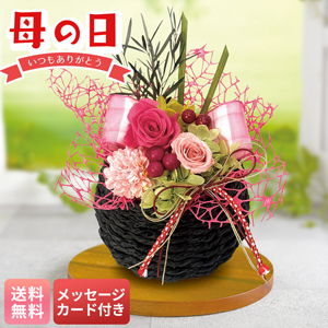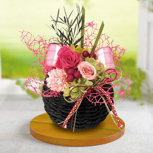 やさしいピンク色のプリザーブドフラワーを使用した、和の雰囲気を感じさせるバスケットアレンジメント。