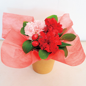 定番の赤いカーネーションにイチゴの造花を合せてかわいくアレンジしました。