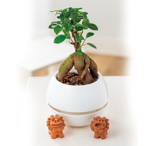 光沢のある深緑の葉が美しいガジュマルに、沖縄で魔除けとされるシーサーを添えてお届けします。