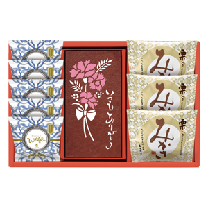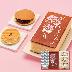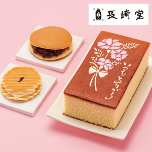 「長﨑堂」のメッセージ付カステーラと栗入りみかさなど銘菓を詰合せました。