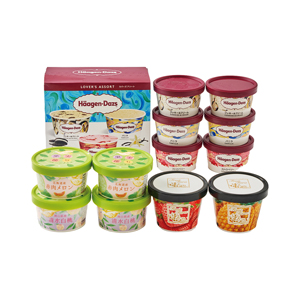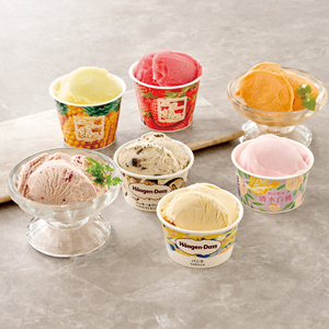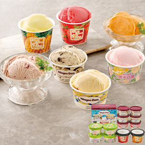 ハーゲンダッツラバーズアソート(バニラ・ストロベリー・クッキー&クリーム)各70ml×各2、フルーツティアラソルベ(イチゴ・パインアップル)各108ml、国産フルーツアイス(北海道メロン・清水白桃)各70ml×各2