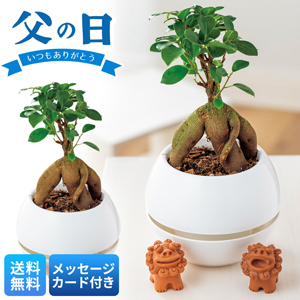 光沢のある深緑の葉が美しいガジュマルに、沖縄で魔除けとされるシーサーを添えてお届けします。
